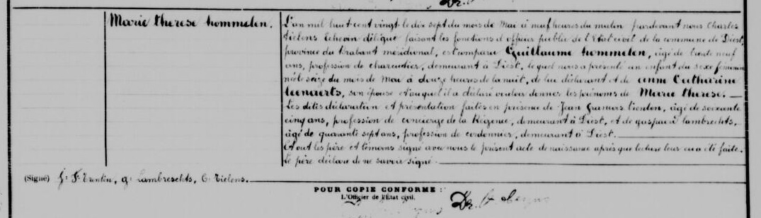 Marie Therese Hommelen wordt geboren op 16 mei 1820 om middernacht. Zij is de dochter van Guillielmus Hommelen en Anna Catharina Leenaerts. Haar vader was ‘charcutier’ in Diest. Hij sterft in 1839, Marie Therese is dan 19 jaar. Merkwaardig is dat in 1822 haar zusje geboren wordt en ook de naam Marie Therese krijgt.