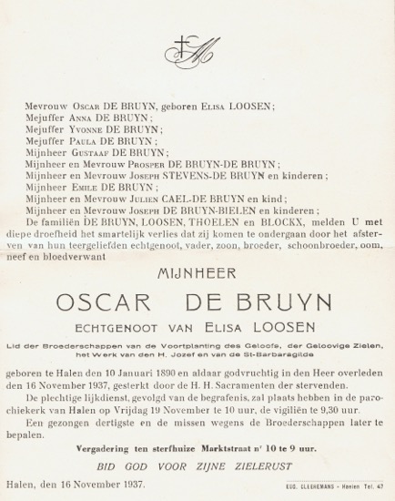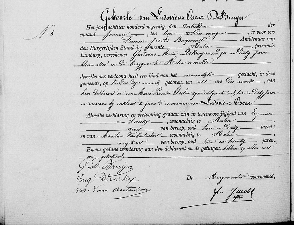Op 10 januari 1890 om acht uur ’s avonds worden de Braggen in Halen opgeschrikt door een schreiende baby. Ludovicus Oscar De Bruyn is het derde kind en de tweede zoon voor Gustaaf De Bruijn en Maria Thoelen.